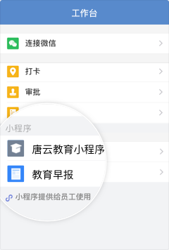 企业可开发微信小程序,接入企业微信中运行和使用。可通过与微信消息互通,由员工发给微信客户使用;也可配置到工作台,给员工内部办公使用