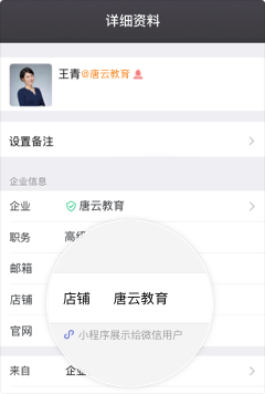 在通讯录成员的对外信息中添加关联的小程序,即可展示给微信用户,微信用户点击后直接打开小程序