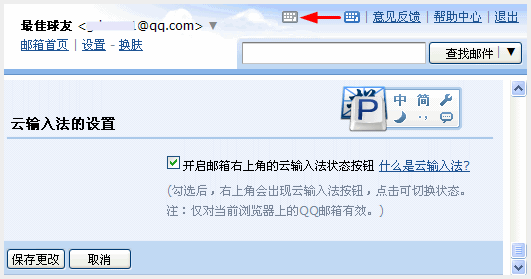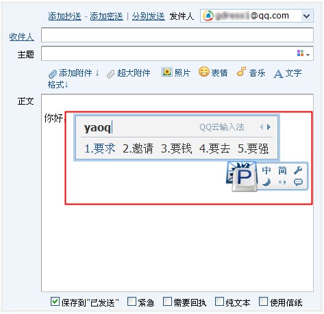 1. 什么是QQ邮箱的云输入法 QQ云输入法是利用云计算和网页技术实现的网页拼音输入工具。是一个跨平台,免安装,在线使用的输入法。 无论在任何地方登录QQ邮箱,即使您的电脑不支持中文输入,你都可在当前浏览器的QQ邮箱页面,畅行无阻地输入中文。 了解更多 2. 如何开启/关闭QQ云输入法 您可以在【设置】-【常规】中,打开云输入法状态按钮,即可在邮箱右上角看到状态按钮 。点击可进行开启/关闭的切换。![]() 3. 如何使用 对当前邮箱帐号成功开通QQ云输入法后,在当前浏览器下,任意QQ邮箱页面的任意输入框,您均可使用QQ云输入法输入拼音。 您还可以进行中/英文切换,修改输入法设置等。QQ云输入法现在可以应用于所有主流浏览器上,如 IE 6-8,Firefox 1.5-3.7,Opera 9-10,Safari 3-4,Chrome 1-5。 ![]() |