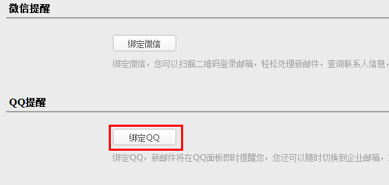 绑定方法 企业成员登录邮箱后,选择“设置”-“提醒服务”,选择“绑定QQ”,填入您的QQ号码及QQ密码,即可进行绑定。