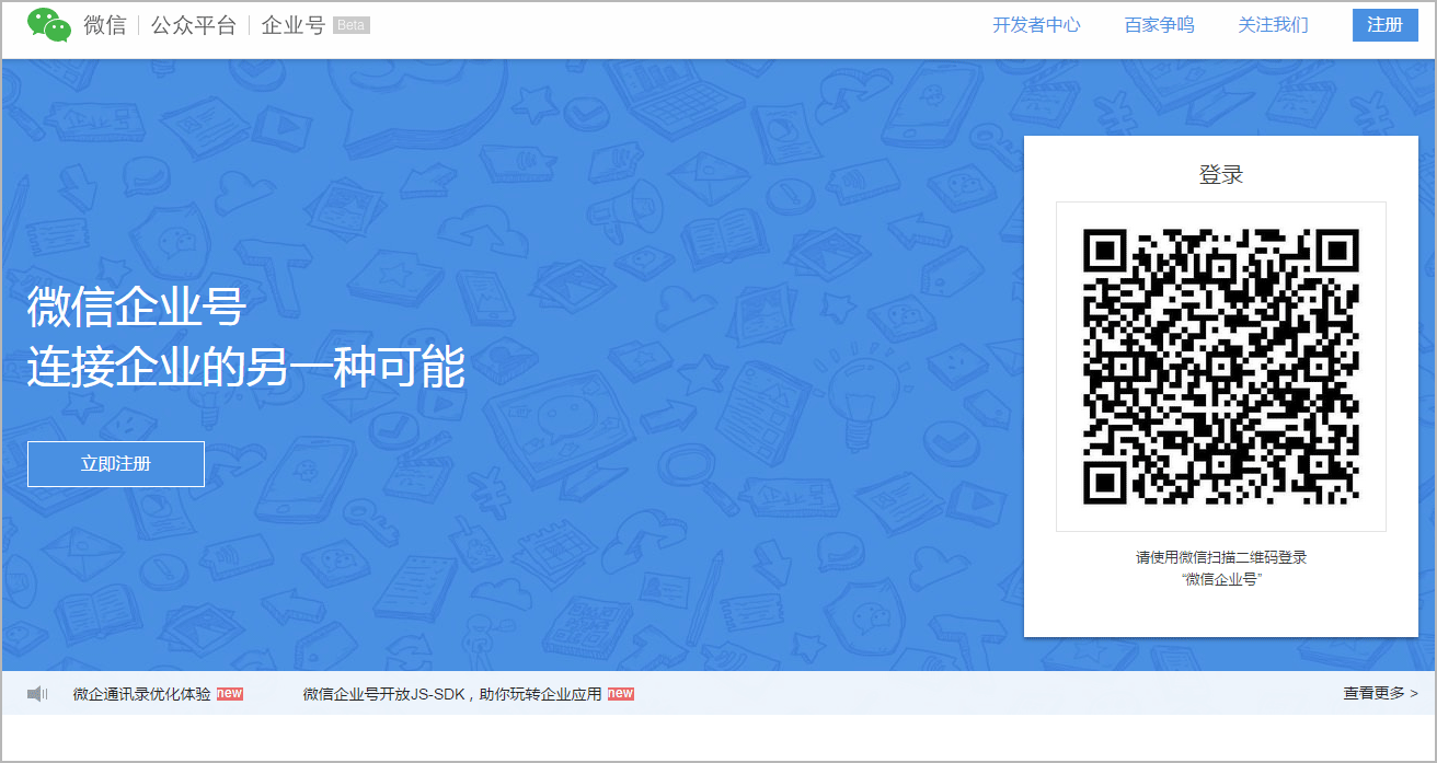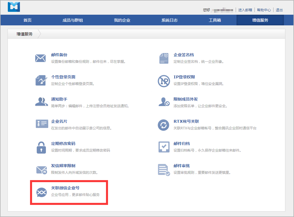 以下是开启的教程: 步骤一,关联腾讯企业邮与微信企业号 1.在管理员网页的“增值服务”中选择“关联微信企业号”。 2. 点击“关联微信企业号”。 (没有企业号的用户请先到企业号官网申请) 3.登录微信企业号并授权给腾讯企业邮。 步骤二,导入企业通讯录 导入通讯录,将邮箱和组织架构等信息导入企业号,创建企业号的成员账号。 (如果您的企业号已存在企业成员的账号,您可以跳过此步骤) 步骤三,企业号发送邀请邮件,成员自行关注 导入的成功的企业成员,将收到企业号的邀请关注邮件,成员关注企业号即完成了成员的导入。 (如果您的企业号已存在企业成员的账号,您可以跳过此步骤) 步骤四,设置应用可见范围 在企业号的网页上设置“微企邮箱”的可见范围,即哪些企业成员或部门可以使用。 1. 登录微信企业号(qy.weixin.qq.com) 2. 在“应用中心”里选择“微企邮箱”,并进入其“应用设置” 3. 添加允许使用“微企邮箱”的成员或部门 完成上述设置后,您的企业成员就能在微信企业号里使用“微企邮箱”了。 |