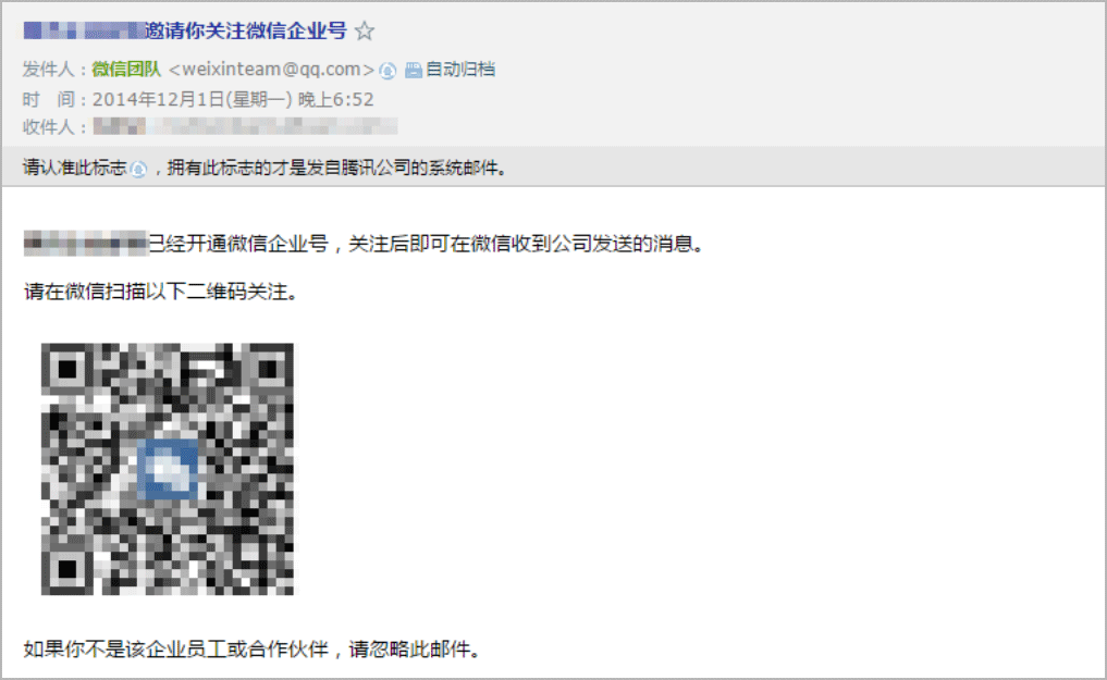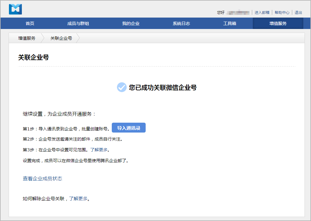 尊贵的腾讯企业邮用户,您享有便捷开启“微企邮箱”的特权,支持一键导入企业通讯录到企业号,轻松为企业成员开启应用。