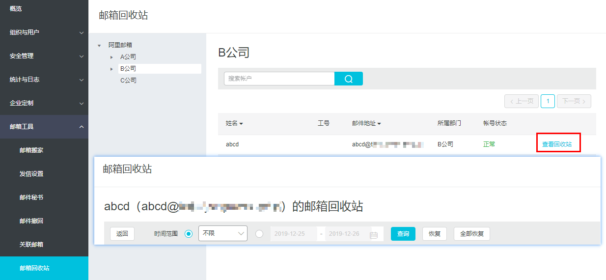 阿里企业邮箱支持在邮箱管理平台查看员工账号的邮箱回收站。如果员工账号不小心在 已删除 页面彻底删除了邮件,或者配置Outlook、Foxmail的IMAP客户端自动将邮件删除,管理员可以在邮箱管理平台的 邮件回收站 页面查看员工账号的邮箱回收站,并恢复邮件。