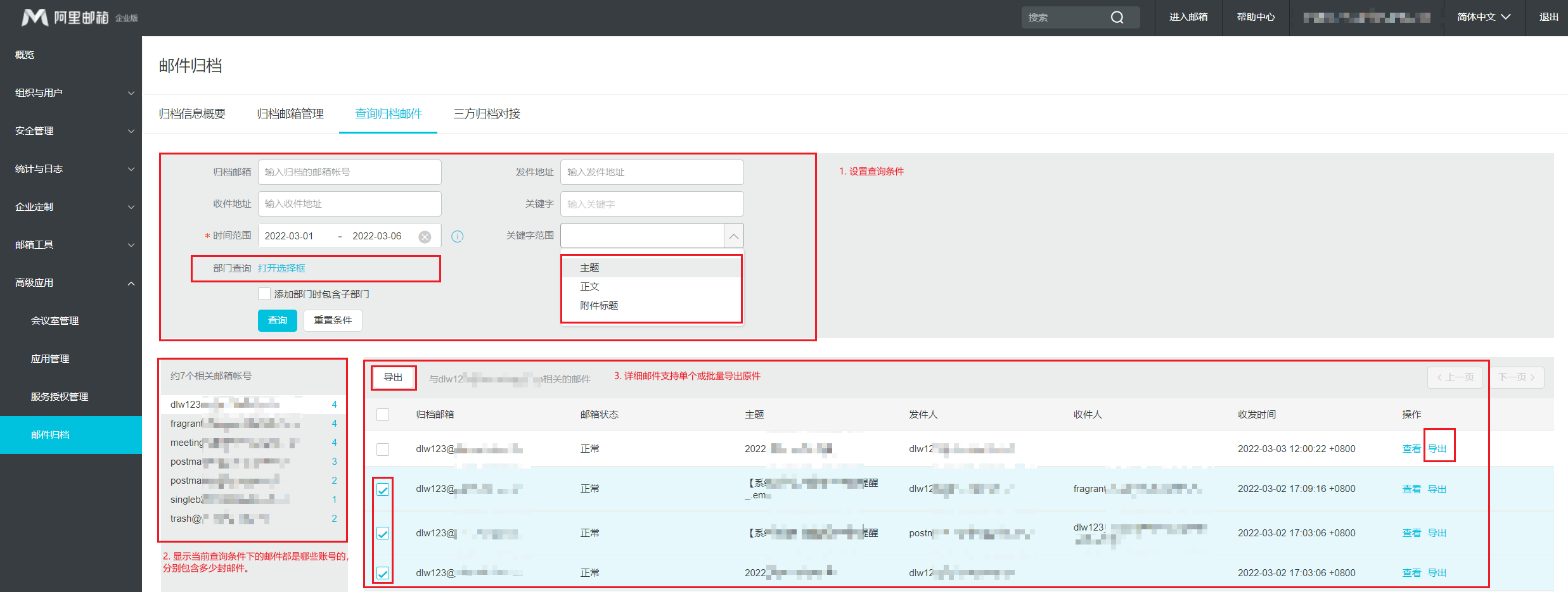 导出归档邮件:导出支持单封邮件导出也支持批量导出。