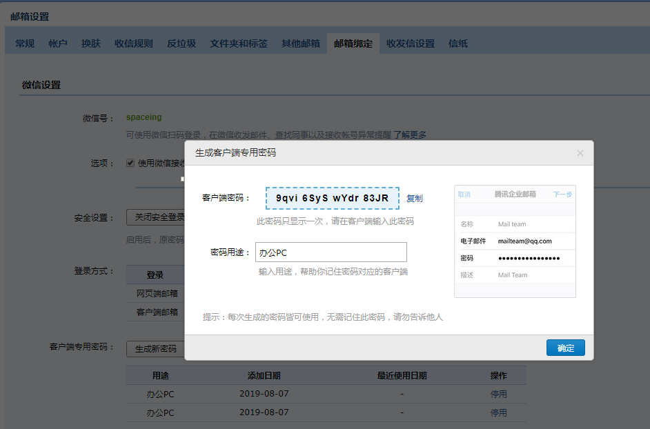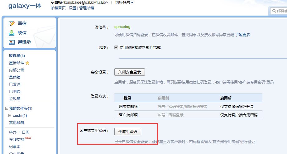 另外,网页端开启安全登录后,在微信公众号或者小程序进入邮箱后在设置-客户端密码里面也可以获取,获取客户端密码记录会同步至网页端。