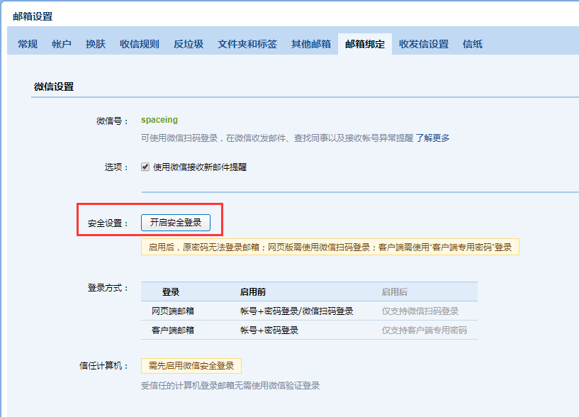 1.绑定微信之后,在安全登录的设置,可以看到【开启安全登录】的按钮,点击开启。