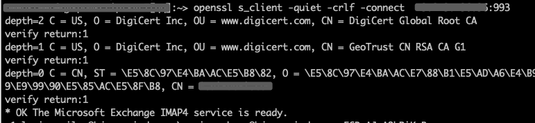B 加密imap协议,使用 openssl s_client -quiet -crlf -connect 原服务器地址:993方式连接原服务器imap服务,如openssl s_client -quiet -connect mail.xxx.com:993